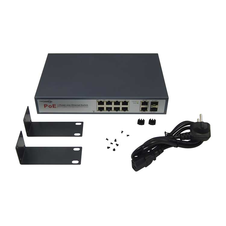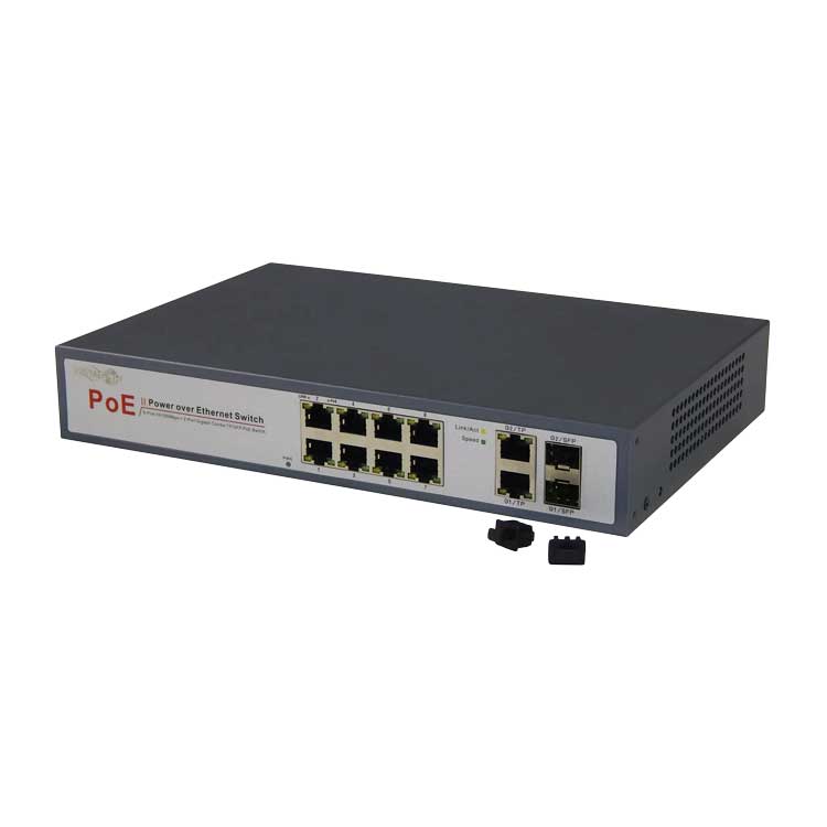 Коммутатор оснащен восемью LAN-портами с поддержкой питания РоЕ-устройств до 30Вт на порт, двумя LAN-портами совмещенными c двумя оптическими SFP-портами. Суммарное PoE питание до 120Вт.